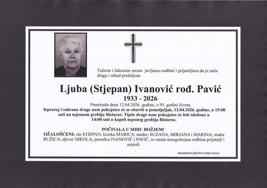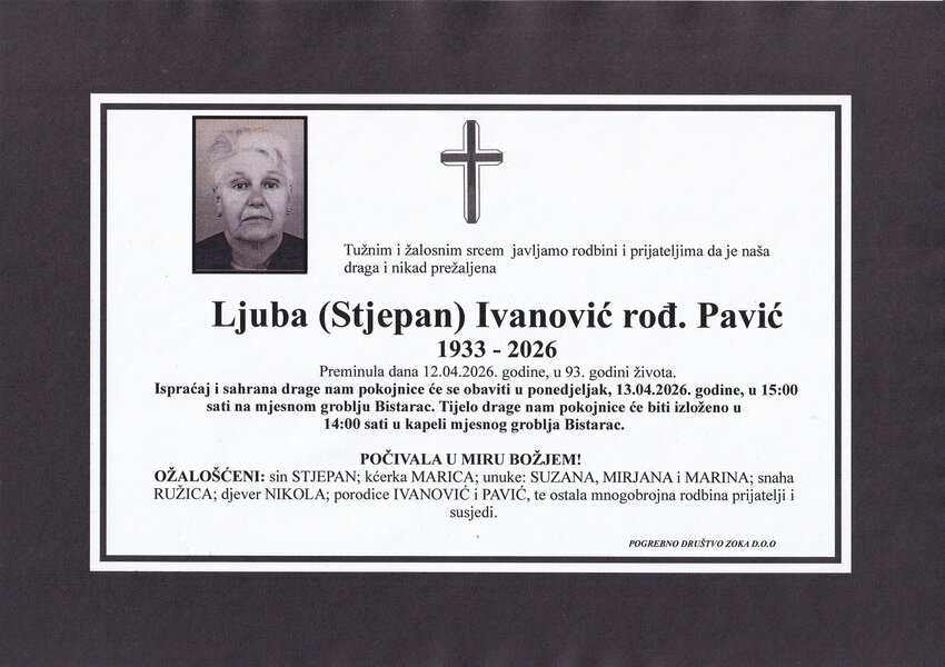 In memoriam: Ljuba STJEPANOVIĆ (Pavić)Ispraćaj i sahrana obavit će se u ponedjeljak, 13. aprila 2026. godine, u 15 sati, na mjesnom groblju Bistarac. Laka joj bh. zemlja Desk12. 04. 2026.In memoriam, Info (Iskrena sućut obitelji i odbini. Počivala u miru Božjem – Tuzlalive.ba, Foto: PD ZOKA, Tuzla) Post Views: 65 Podijeli