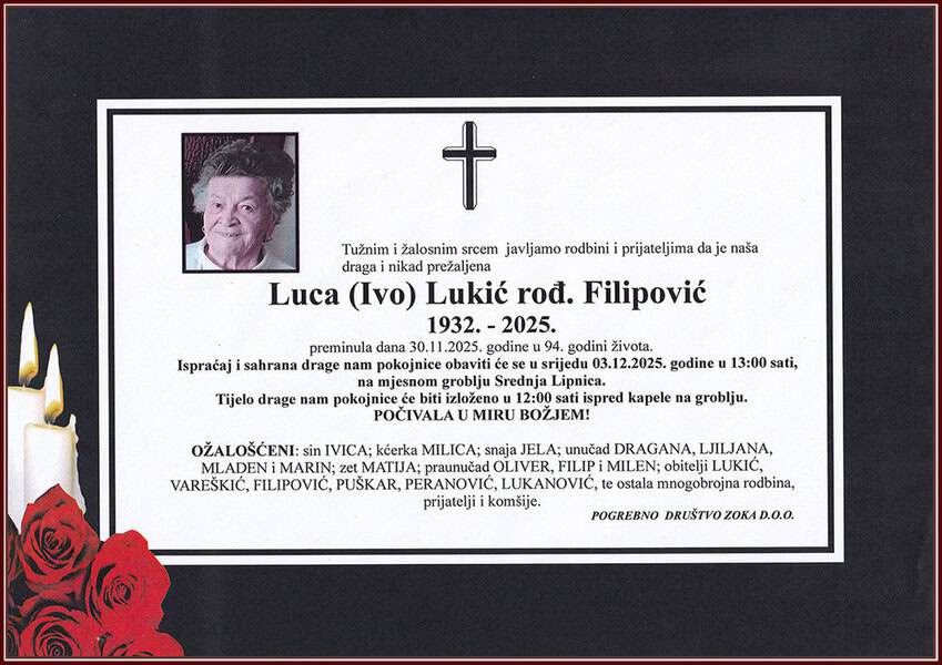 Ispraćaj i sahrana pokojnice obavit će se u srijedu, 3. decembra 2025. godine, u 13:00 sati, na mjesnom groblju Srednja Lipnica. Počivala u miru Božjem