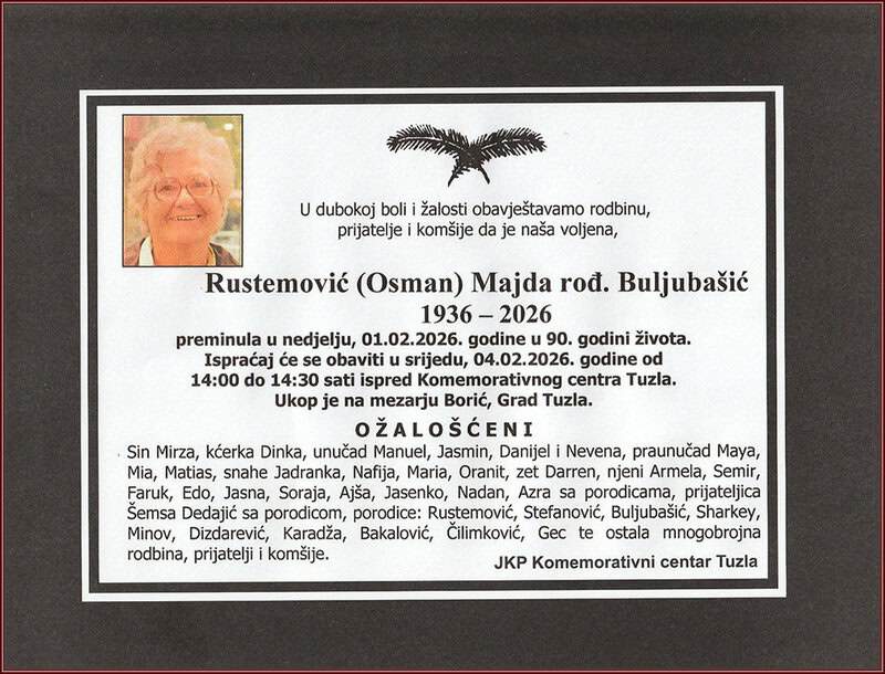 Preminula je naša sugrađanka, komšinica i prijateljica, Majda RUSTEMOVIĆ (Buljubašić). Upućujemo joj posljednji pozdrav. Slava joj i hvala. Mir duši njenoj. Laka joj bh. zemlja