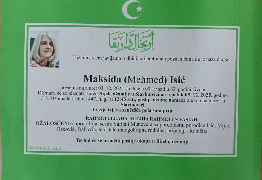 In memoriam: Maksida (Mehmeda) ISIĆPrerano nas je, u 63. godini, napustila Maksida (Mehmeda) ISIĆ. Upućujemo joj posljednji pozdrav, mir duši njenoj. Laka joj bh. zemlja Desk04. 12. 2025.In memoriam, Info (Porodici i rodbini upućujemo iskreno saučešće. Mir duši njenoj – portal Tuzlalive.ba; Foto: PP Revda Tuzla) Post Views: 16 Podijeli