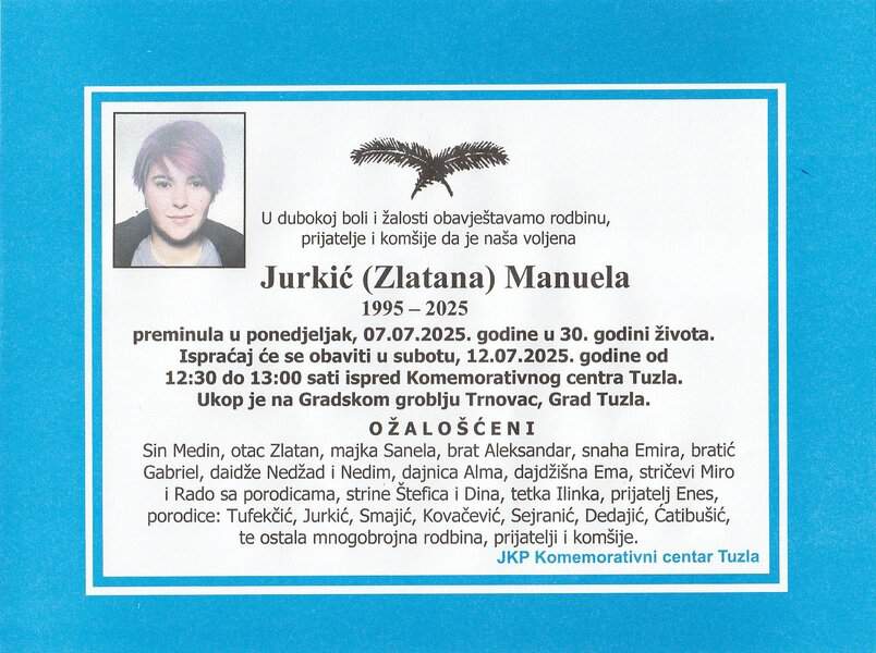 Vrlo mlada preminula je Manuela (Zlatana) Jurkić. Mir duši njenoj. Laka joj bh. zemlja. Saučešće porodici i rodbini...