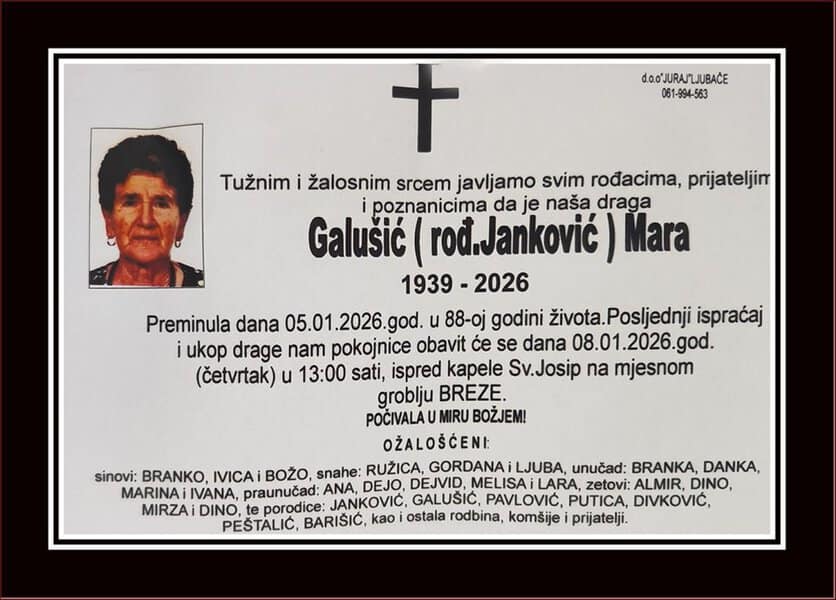 Posljednji ispraćaj i ukop pokojnice obavit će se u četvrtak, 8. januara 2026. godine u 13:00 sati, na mjesnom groblju Breze, Morančani
