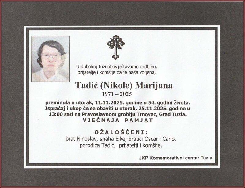 Prerano je, u 54. godini, preminula Marijana (Nikole) TADIĆ. Upućujemo joj posljednji pozdrav. Počivala u miru Božjem. Laka joj bh. zemlja...