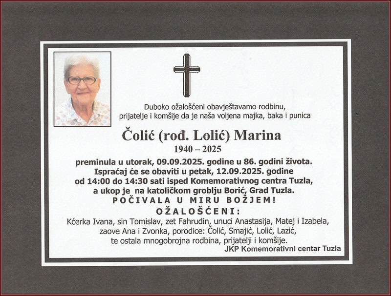 Preminula je naša ugledna sugrađanka, prijateljica i susjeda, Marina ČOLIĆ (Lolić). Upućujemo joj posljednji pozdrav. Počivala u miru Božjem. Laka joj bh. zemlja...