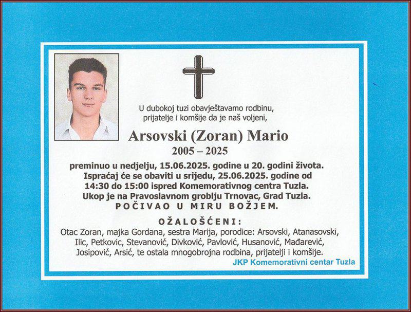 Vrlo mlad nas je napustio sugrađanin, prijatelj i drugar, Mario (Zorana) ARSOVSKI. Upućujemo mu posljednji pozdrav. Počivao u miru Božjem. Laka mu bh. zemlja