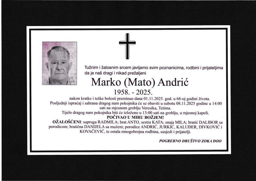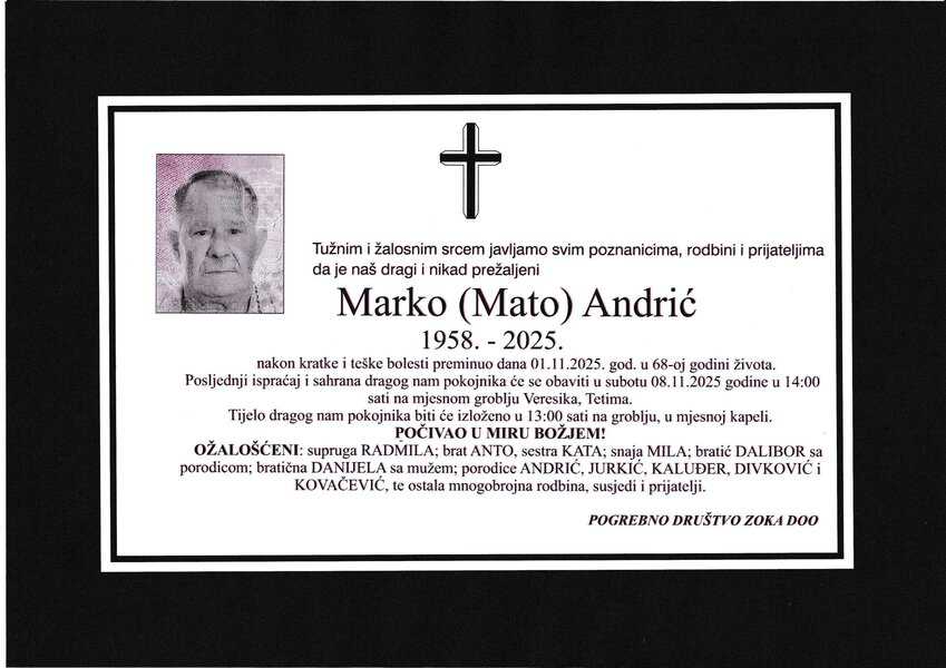 In memoriam: Marko (Mate) ANDRIĆPočivao u miru Božjem. Laka mu bh. zemlja Desk05. 11. 2025.In memoriam, Info (Iskrena sućut obitelji i rodbini. Počivao u miru Božjem – portal Tuzlalive.ba; Foto: PD ZOKA, Tuzla) Post Views: 181 Podijeli
