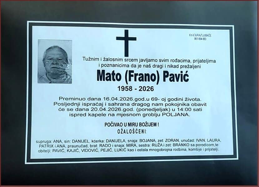 Ispraćaj i sahrana pokojnika obavit će se u ponedjeljak, 20. aprila 2026. godine u 14 sati, ispred kapele na mjesnom groblju Poljana
