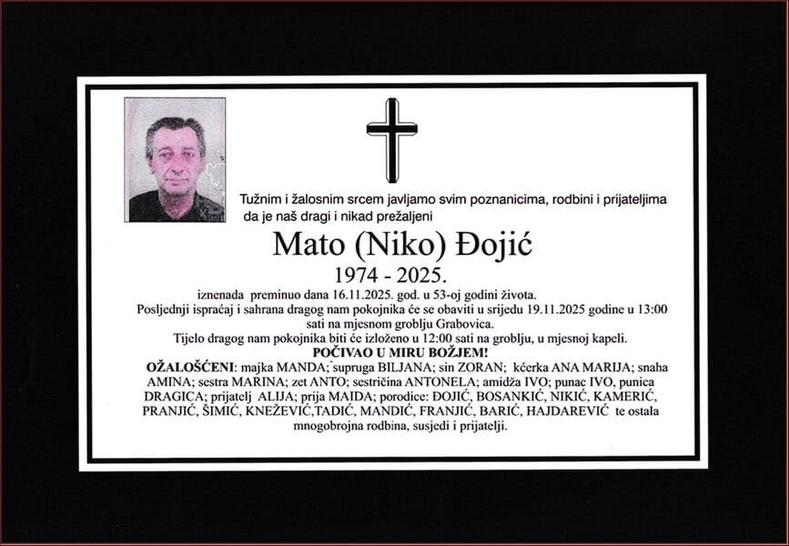 Prerano nas je, u 53. godini, napustio sugrađanin, prijatelj i komšija, Mato (Nike) ĐOJIĆ. Upućujemo mu posljednji pozdrav. Počivao u miru Božjem. Laka mu bh. zemlja