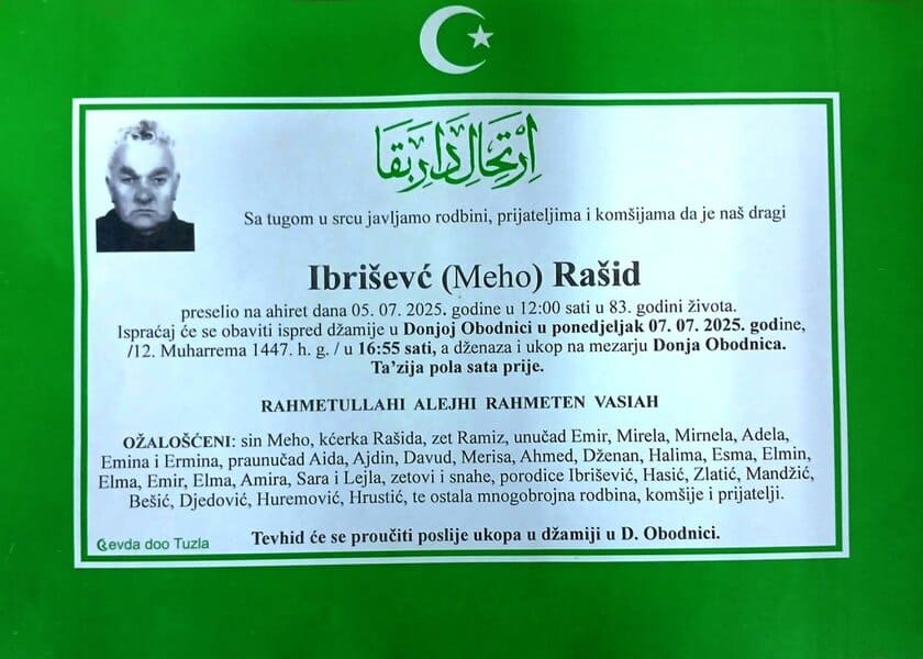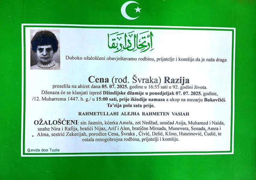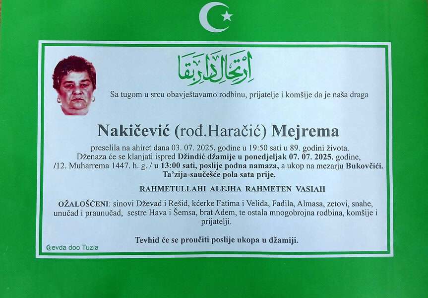 In memoriam: Mejrema NAKIČEVIĆ, Rašid IBRIŠEVIĆ, Razija CENAPreminuli su nađi sumještani i komšije. Neka im je rahmet dušama, a laka bh. zemlja (Otvori grafiku) Desk06. 07. 2025.In memoriam, Info (Porodicama i rodbini izražavamo saučešće, mir dušama njihovim – portal Tuzlalive.ba; Foto: PP Revda TUzla) Post Views: 286 Podijeli