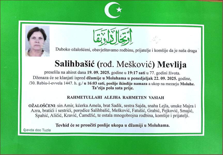 Dženaza će se klanjati ispred džamije Moluhe, u ponedjeljak, 22. septembra 2025. godine u 16:03 sati...