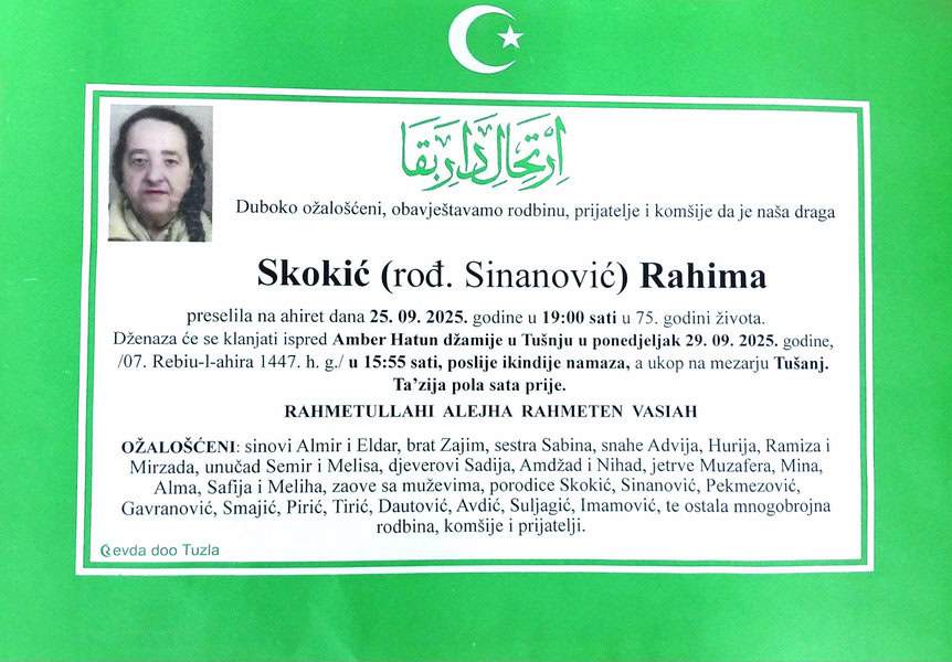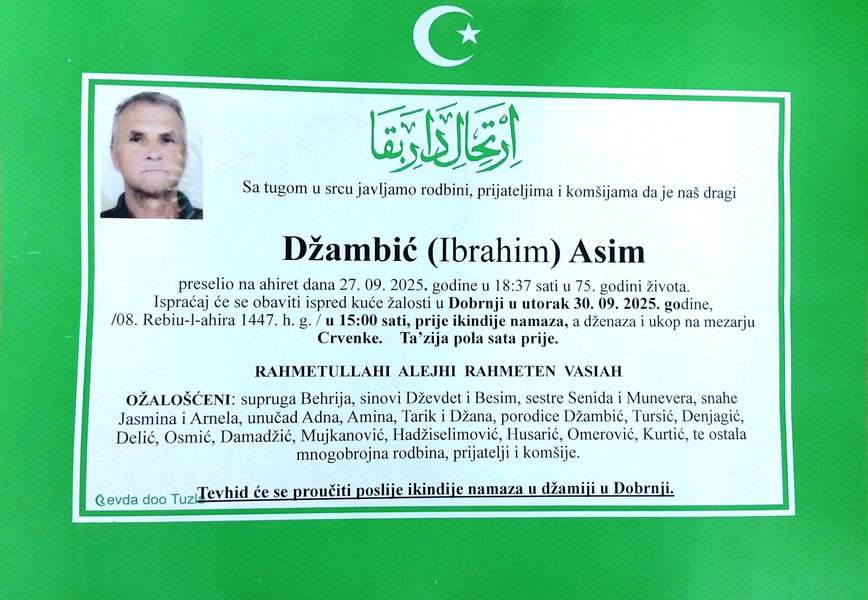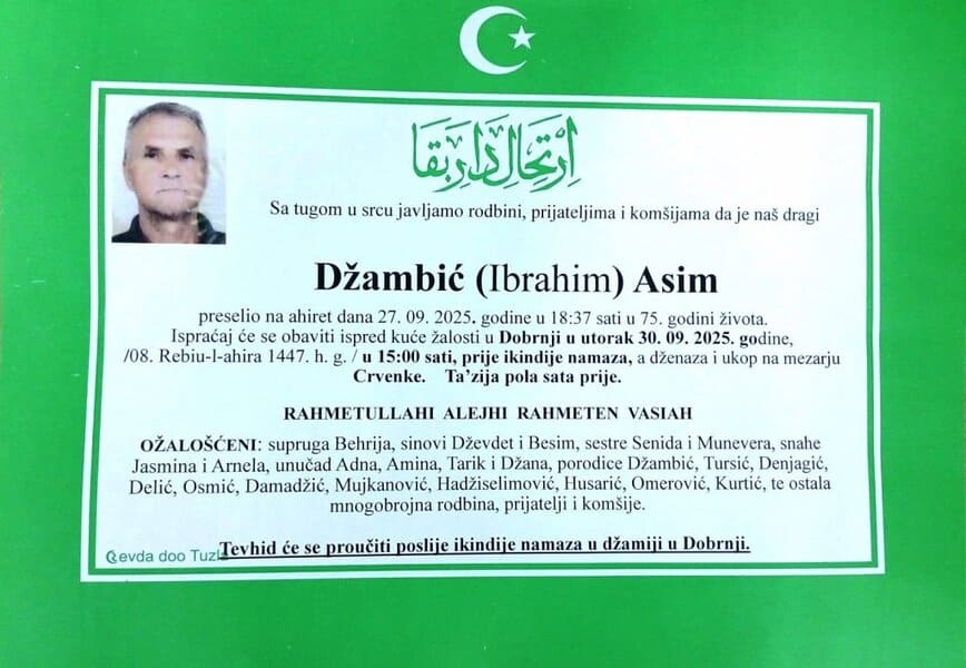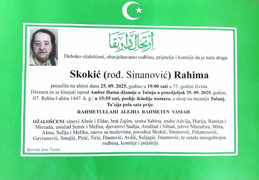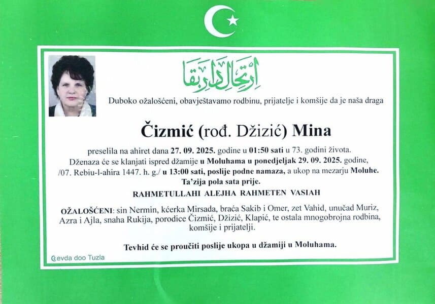 In memoriam: Mevlija-Zehra IMAMOVIĆ, Asim DŽAMBIĆ, Rahima SKOKIĆ, Mina ČIZMIĆ (Foto)Preminulo je više naših sumještanki i sumještana. Upućujemo im posljednji pozdrav. Mir dušama njihovim. Laka im bh. zemlja... Desk28. 09. 2025.In memoriam, Info (Iskreno saučešće poprodici, rodbini i prijateljima – TuzlaLIVE.ba, Foto: PP Revda Tuzla) (Porodicama i rodbini upućujemo iskreno saučešće – Tuzlalive.ba; Foto: PP Revda Tuzla) Post Views: 205 Podijeli