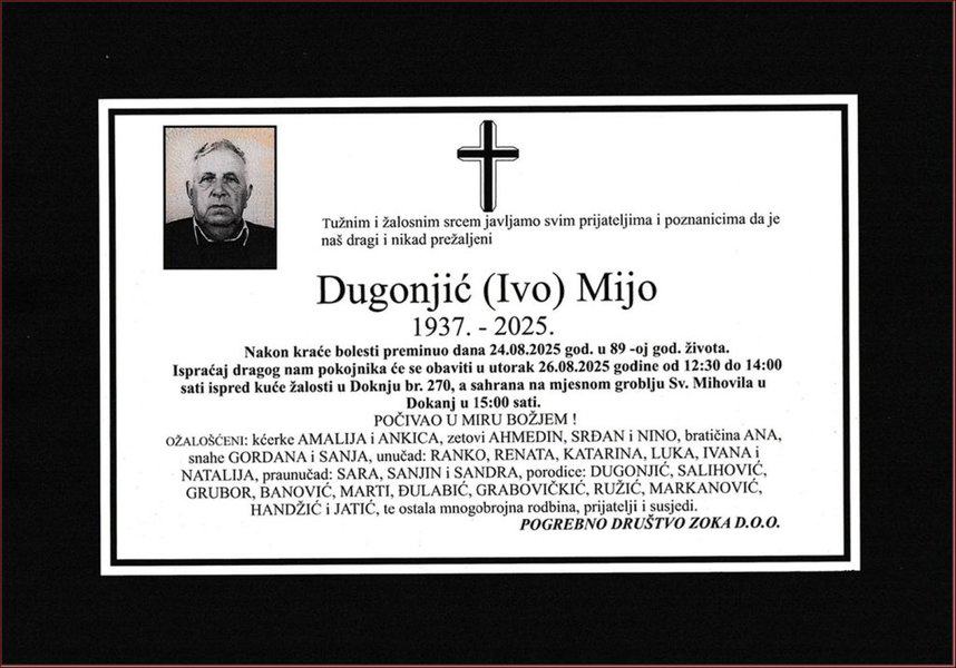 In memoriam: Mijo (Ive) DUGONJIĆPočivao u miru Božjem. Laka mu bh. zemlja... Desk26. 08. 2025.In memoriam, Info (Porodici, rodbini i prijateljima upućujemo iskreno saučešće – TuzlaL!VE.ba, Foto: PD ZOKA, Tuzla) Post Views: 271 Podijeli