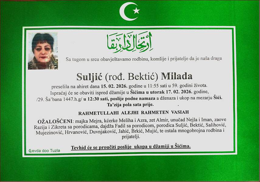 In memoriam: Milada SULJIĆ (Bektić)Prerano nas je napustila Milada Suljić (Bektić). Neka joj je vječni rahmet duši. Laka joj bh. zemlja Desk16. 02. 2026.In memoriam, Info (Porodici, rodbini i prijateljima upućujemo iskreno saučešće – TuzlaL!VE.ba, Foto: PP Revda Tuzla) Post Views: 304 Podijeli