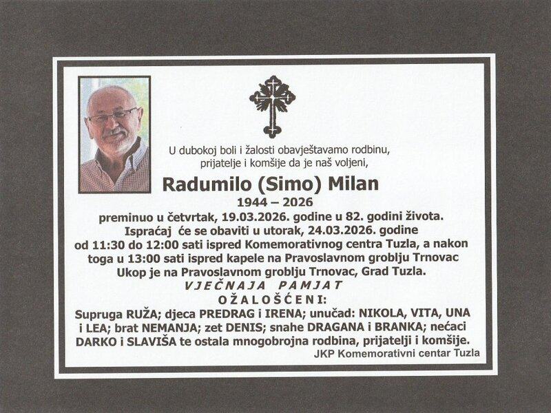 Ispraćaj će se obaviti u utorak, 24. marta 2026. godine, ispred Komemorativnog centra u Tuzli, u vremenu od 11:30 do 12:00 sati, a nakon toga ispred kapele na Pravoslavnom groblju Trnovac u 13:00 sati. Laka mu bh. zemlja