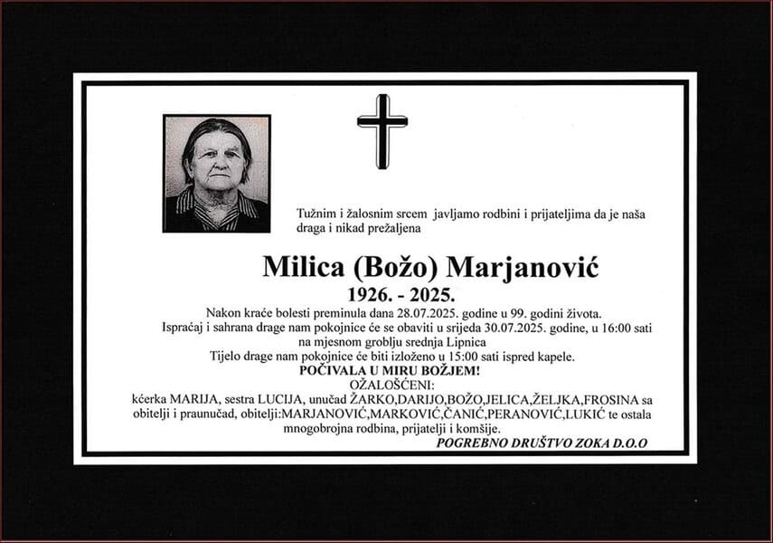 Nakon kraće bolesti preminula je u 99. godini Milica (Bože) MARJANOVIĆ. Počivala u miru Božjem. Laka joj bh. zemlja