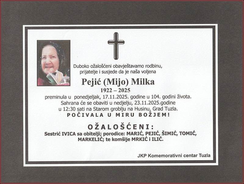 Preminula je u 104. godini Milka (Mije) PEJIĆ. Upućujemo joj posljednji pozdrav. Počivala u miru Božjem. Laka joj bh. zemlja...