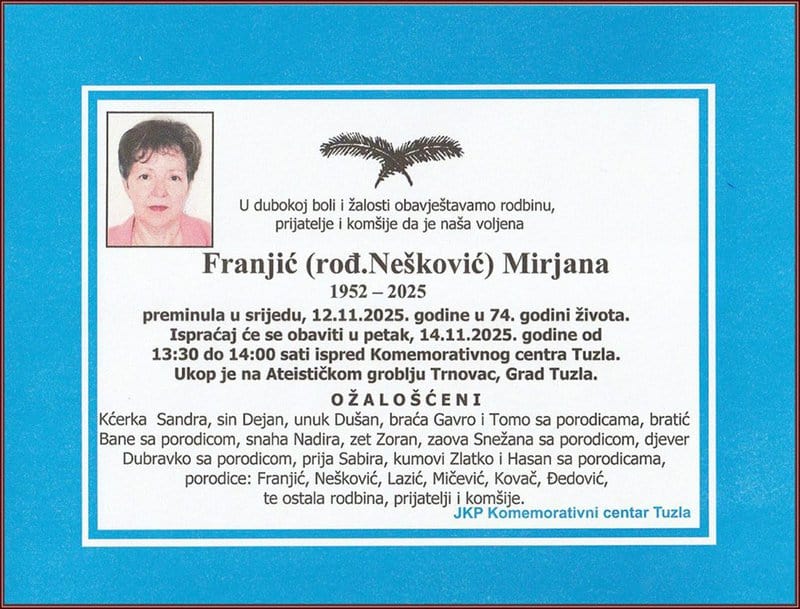 Ispraćaj će se obaviti u petak, 14. novembra 2025. godine od 13:30 do 14:00 sati, ispred Komemorativnog centra u Tuzli...