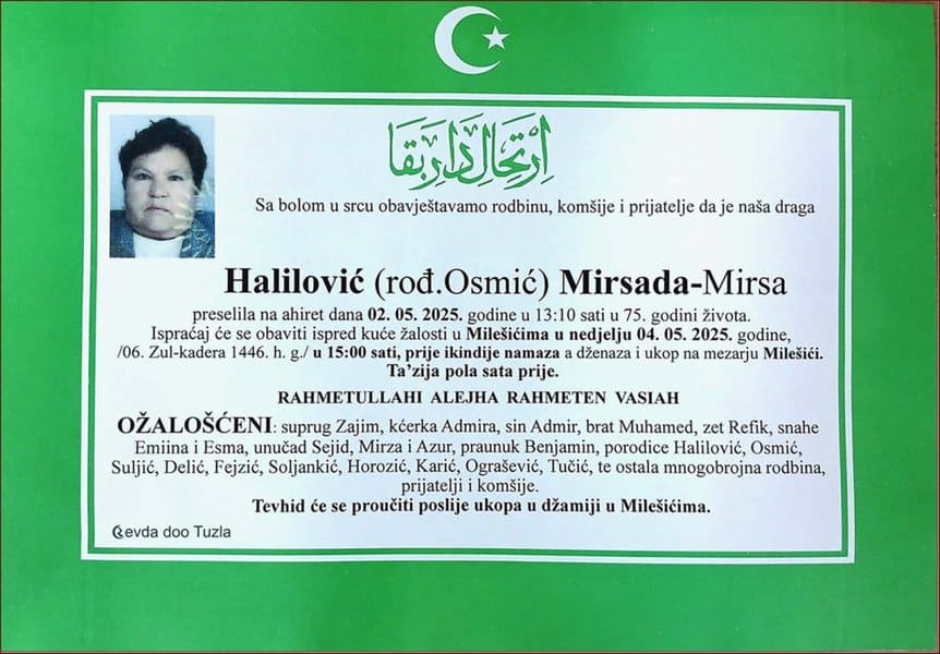 In memoriam: Mirsada-Mirsa HALILOVIĆ (Osmić)Preselila na ahiret u 75. godini. Mir duši njenoj i vječni rahmet. Laka joj bh. zemlja... Desk03. 05. 2025.In memoriam, Info (Porodici, rodbini i prijateljima upućujemo iskreno saučešće – TuzlaL!VE.ba, Foto: PP Revda Tuzla) Post Views: 303 Podijeli