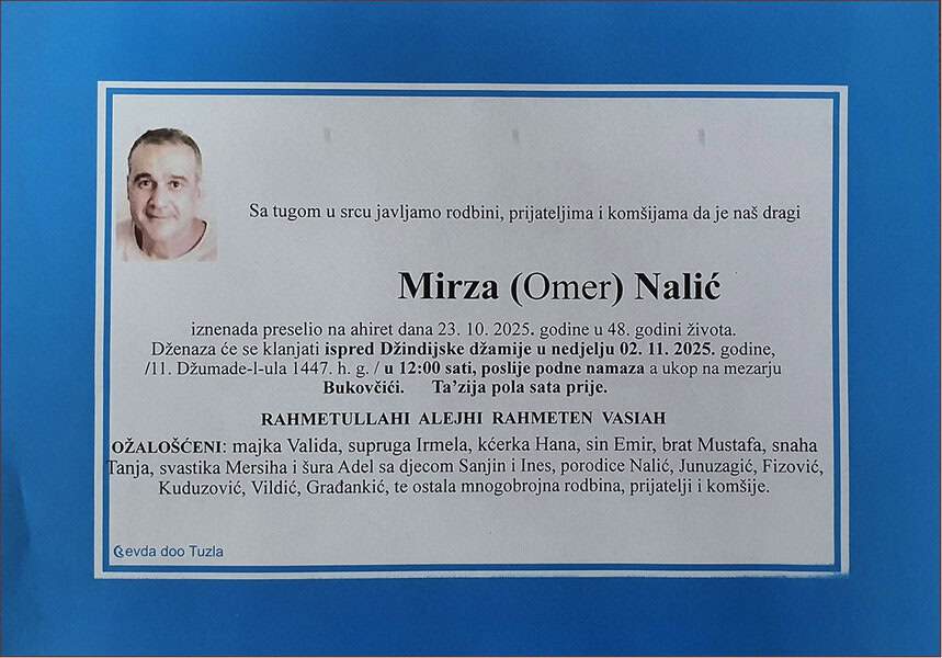 Vrlo mlad nas je, u 48. godini, napustio sugrađanin, komšija, dobra raja, Mirza (Omera) NALIĆ. Šaljemo mu posljednji pozdrav. Neka mu vječna slava i hvala. Laka mu bh. zemlja