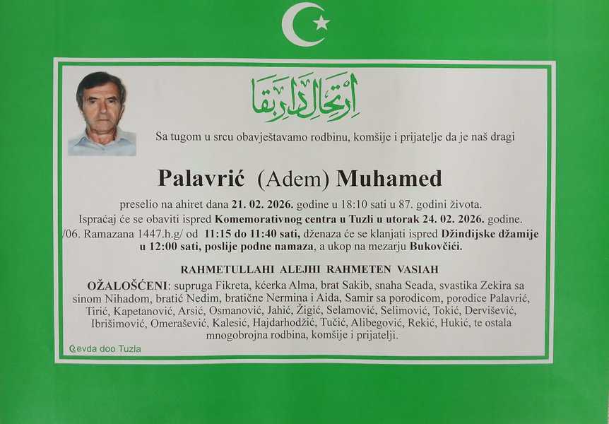 Ispraćaj će se obaviti ispred Komemorativnog centra u Tuzli, u utorak, 24. februara 2026. godine, od 11:15 do 11:45 sati.