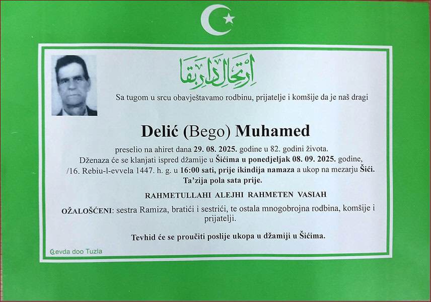 Dženaza će se klanjati ispred džamije u Šićima, u ponedjeljak, 8. septembra 2025. godine. Mir duši njegovoj. Laka mu bh. zemlja
