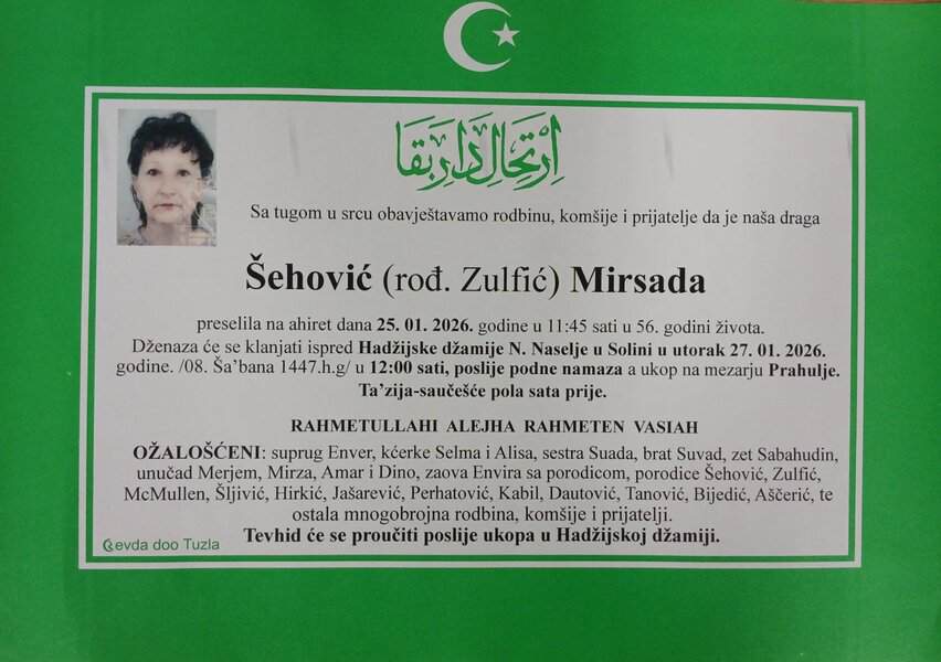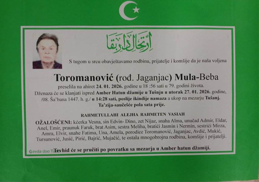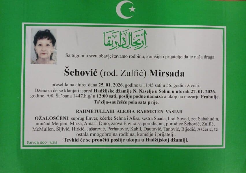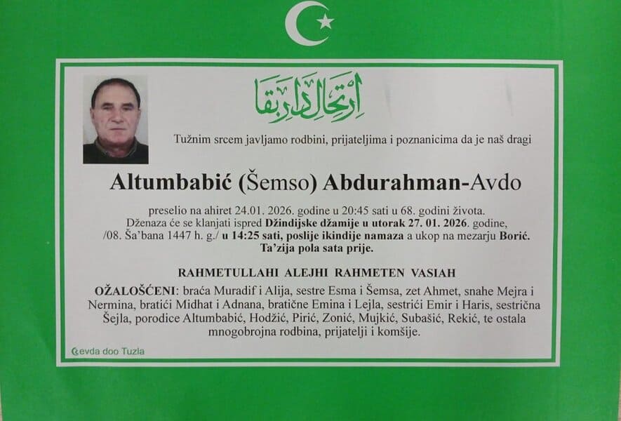 In memoriam: Mula-Beba TOROMANOVIĆ, Abdurahman-Avdo ALTUMBABIĆ, Mirsada ŠEHOVIĆ (Foto)Neka je vječni rahmet njihovim dušama. Porodicama saučešće i sabur. Laka im bh. zemlja Desk26. 01. 2026.In memoriam, Info (Iskreno saučešće porodicama i rodbini. Mir dušama njihovim – TuzlaLIVE.ba; Foto: PP Revda Tuzla) Post Views: 196 Podijeli