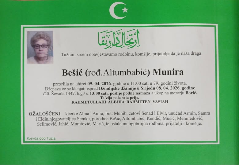 In memoriam: Munira BEŠIĆ (Altumbabić)Dženaza će se klanjati ispred Džindijske džamije u Tuzli, u srijedu, 8. aprila 2026. gopdine, u 13:00 sati, dok je ukop na mezarju Borić Desk07. 04. 2026.In memoriam, Info (Iskreno saučešće porodici i rodbini. Mir duši njenoj – Tuzlalive.ba; Foto: PP Revda Tuzla) Post Views: 168 Podijeli
