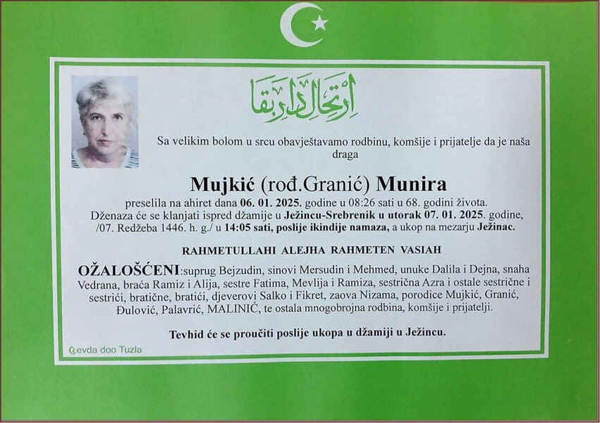 Preselila je na ahiret u 68. godini Munira Mujkić (Granić). Neka je vječni rahmet njenoj duši. Laka joj bh. zemlja