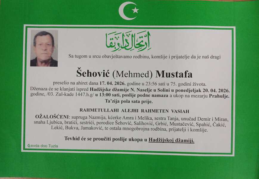 In memoriam: Mustafa (Mehmeda) ŠEHOVIĆDženaza će se klanjati ispred Hadžijske džamije u Novom Naselju - Solina. Neka mu je vječni rahmet duši. Laka mu bh. zemlja Desk20. 04. 2026.In memoriam, Info (Porodici i rodbini izražavamo iskreno saučešće. Mir duši njegovoj – Tuzlalive.ba; Foto: PP Revda Tuzla) Post Views: 139 Podijeli