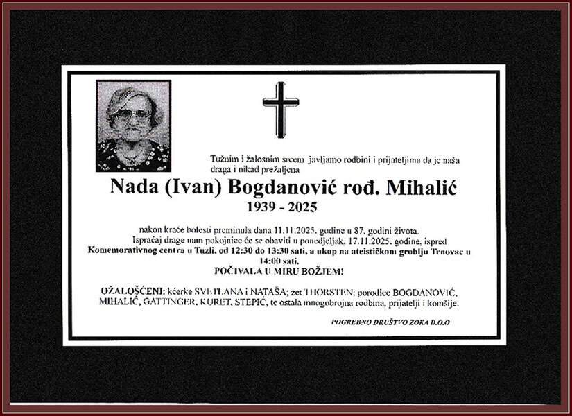 Ispraćaj pokojnice obavit će se u ponedjeljak, 17. novembra 2025. godine, ispred Komemorativnog centra, od 12:30 do 13:00 sati. Ukop je na Ateističkom groblju Trnovac u Tuzli
