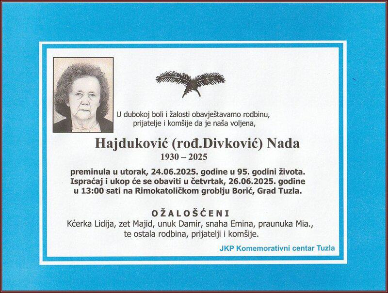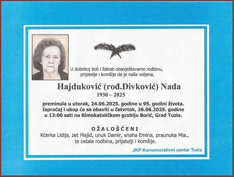 Ispraćaj i ukop obavit će se u četvrtak, 26. juna 2025. godine, u 13:00 sati, na Rimokatoličkom groblju Borić u Tuzli