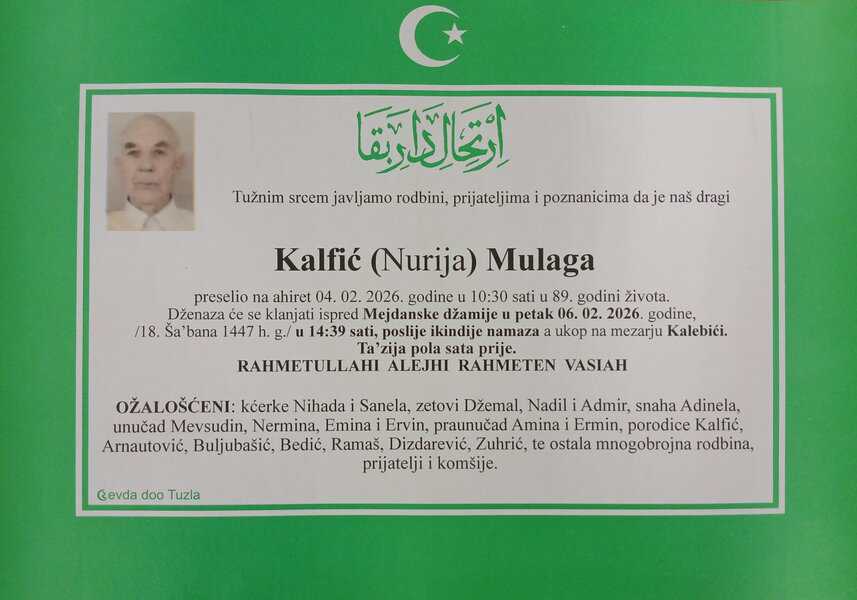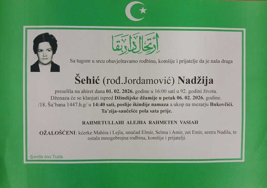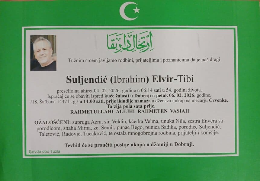 In memoriam: Nadžija ŠEHIĆ, Elvir – Tibi SULJENDIĆ, Mulaga KALFIĆ (Foto)Preselili su na ahiret Nadžija ŠEHIĆ, Elvir - Tibi SULJENDIĆ, Mulaga KALFIĆ. Vječni rahmet njihovim dušama. Laka im bh. zemlja Desk05. 02. 2026.In memoriam, Info (Porodicama i rodbini upućujemo saučešće. Mir dušama njihovim – Tuzlalive.ba; Foto: PP Revda Tuzla) Post Views: 158 Podijeli