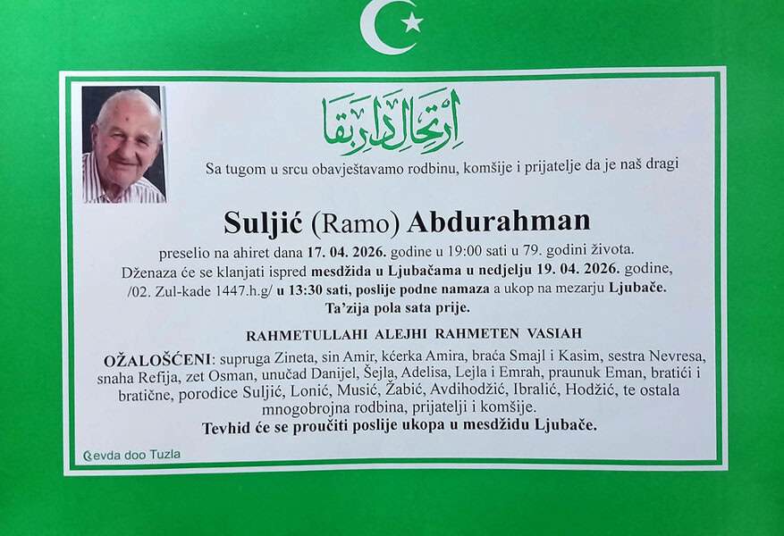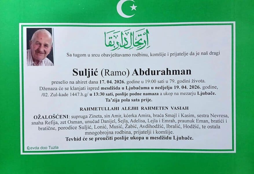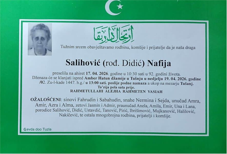 In memoriam: Nafija SALIHOVIĆ (Didić); Abdurahman (Rame) SULJIĆMir dušama njihovim. Porodicama saučešće i sabur. Laka im bh. zemlja Desk18. 04. 2026.In memoriam, Info (Porodicama i rodbini izražavamo iskreno saučešće. Mir dušama njihovim – TuzlaLIVE:ba; Foto: PP Revda Tuzla) Post Views: 5 Podijeli