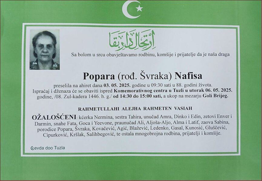 Ispraćaj i dženaza obavit će se u utorak, 6. maja 2025. godine, ispred Komemorativnog centra u Tuzli, od 14:30 do 15:00 sati, a ukop na mezarju Goli Brijeg
