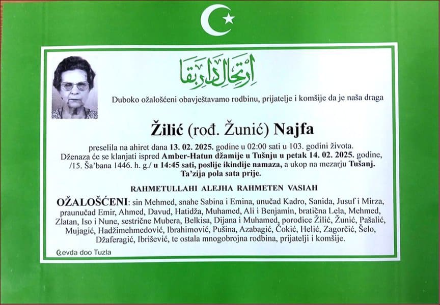 In memoriam: Najfa ŽILIĆ (Žunić)Preselila je na ahiret u 103. godini. Mir duši njenoj. Laka joj bh. zemlja... Desk13. 02. 2025.In memoriam, Info (Porodici, rodbini i prijateljima upućujemo iskreno saučešće – TuzlaL!VE.ba, Foto: PP Revda Tuzla) Post Views: 391 Podijeli