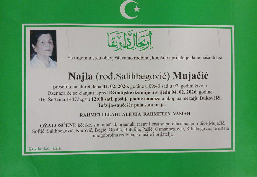 In memoriam: Najla MUJAČIĆ (Salihbegović)Dženaza će se klanjati ispred Džindijske džamije u Tuzli, u srijedu, 4. februara 2026. godine, u 12:00 sati. Ukop je na mezarju Bukovčići Desk03. 02. 2026.In memoriam, Info (Porodici i rodbini upućujemo saučešće i sabur – Tuzlalive.ba; Foto: PP Revda Tuzla) Post Views: 263 Podijeli