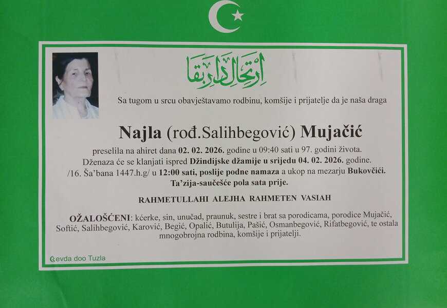 Dženaza će se klanjati ispred Džindijske džamije u Tuzli, u srijedu, 4. februara 2026. godine, u 12:00 sati. Ukop je na mezarju Bukovčići
