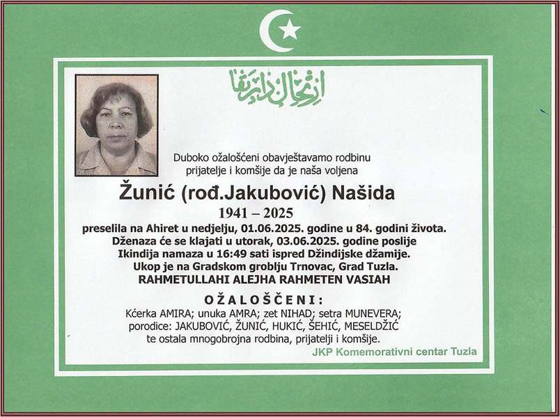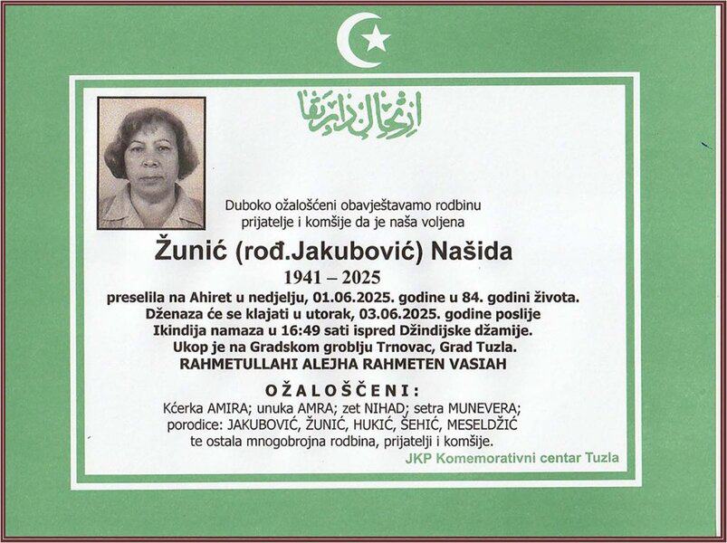 Dženaza će se klanjati ispred Džindijske džamije u Tuzli, u utorak, 3. juna 2025. godine, dok je ukop na Gradskom groblju Trnovac. Porodici saučešće...