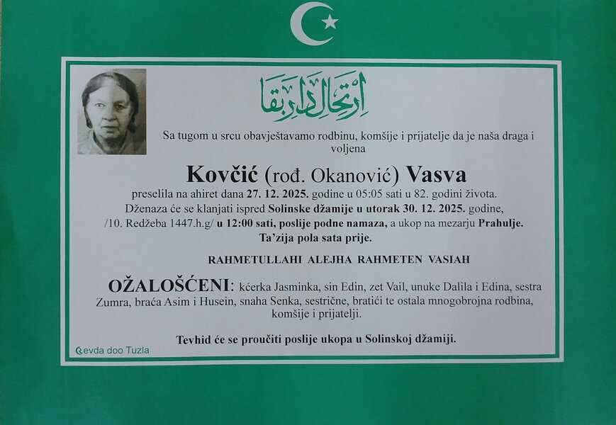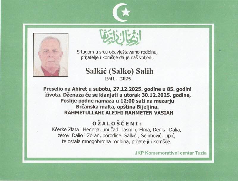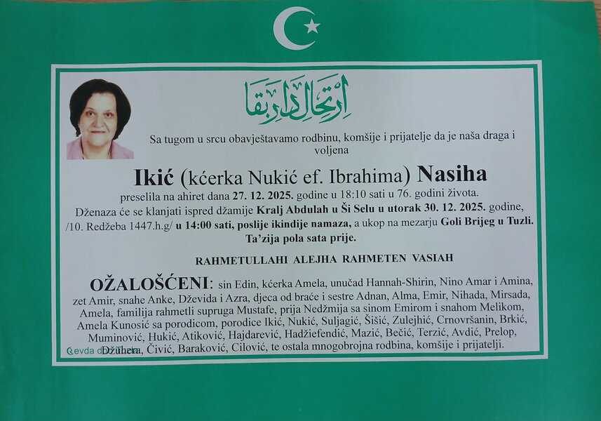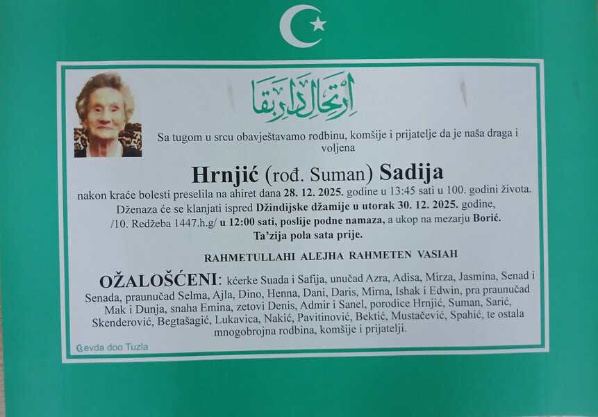 In memoriam: Nasiha IKIĆ, Sadija HRNJIĆ, Salih SALKIĆ, Vasva KOVČIĆ, Šemsudin-Šeni SALIHOVIĆ (Foto)Preminulo je više naših sugrađanki i sugrađana, komšija i prijatelja. Mir dušama njihovim. Laka im bh. zemlja Desk29. 12. 2025.In memoriam, Info (Porodicama i rodbini upućujemo iskreno saučešće. Mir dušama njihovim – Tuzlalive.ba; Foto: PP Revda i Komemorativni centar Tuzla) Post Views: 408 Podijeli