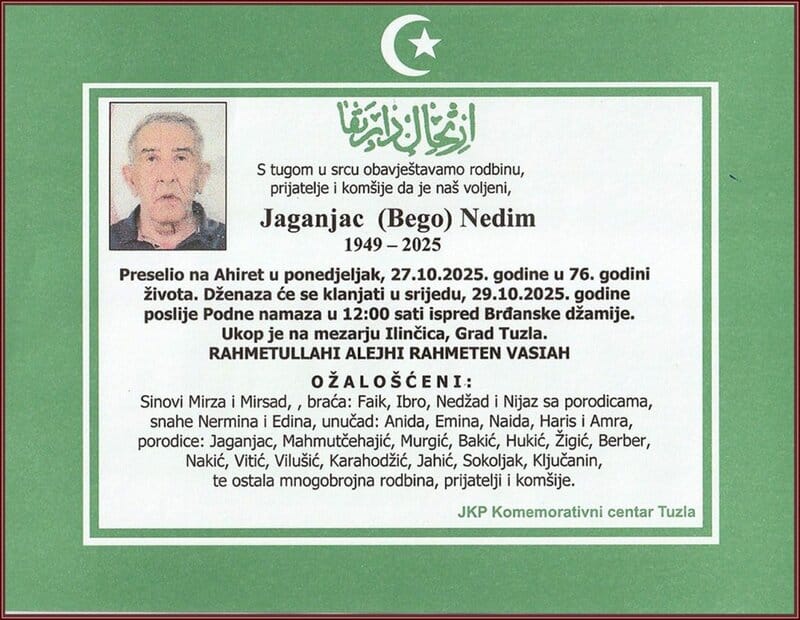 Dženaza će se klanjati u srijedu, 29. oktobra 2025. godine, ispred Brđanske džamije u Tuzli, u 12 sati. Ukop je na mezarju Ilinčica