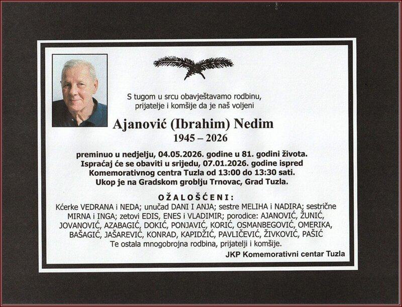 Preminuo je naš ugledni sugrađanin, komšija i prijatelj, nekadašnji sportista i sportski djelatnik, Nedim (Ibrahima) AJANOVIĆ. Počivao u miru. Nek mu je vječna slava i hvala. Laka mu bh. zemlja...