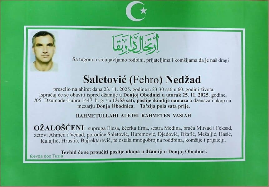 Prerano nas je, u 60. godini, napustio sumještanin, komšija i prijatelj, Nedžad (Fehre) SALETOVIĆ. Neka mu je vječni rahmet duši. Laka mu bh. zemlja...