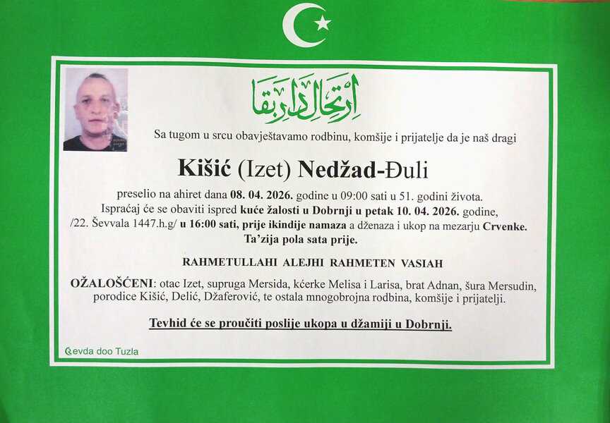 In memoriam: Nedžad (Izeta) KIŠIĆ – Đuli; Talib (Saliha) BEGANOVIĆNeka je vječni rahmet njihovim dušama. Laka im bh. zemlja Desk09. 04. 2026.In memoriam, Info (Porodici i rodbini upućujemo saučešće. Laka im bh. zemlja – Tuzlalive.ba; Foto: PP Revda Tuzla) Post Views: 158 Podijeli
