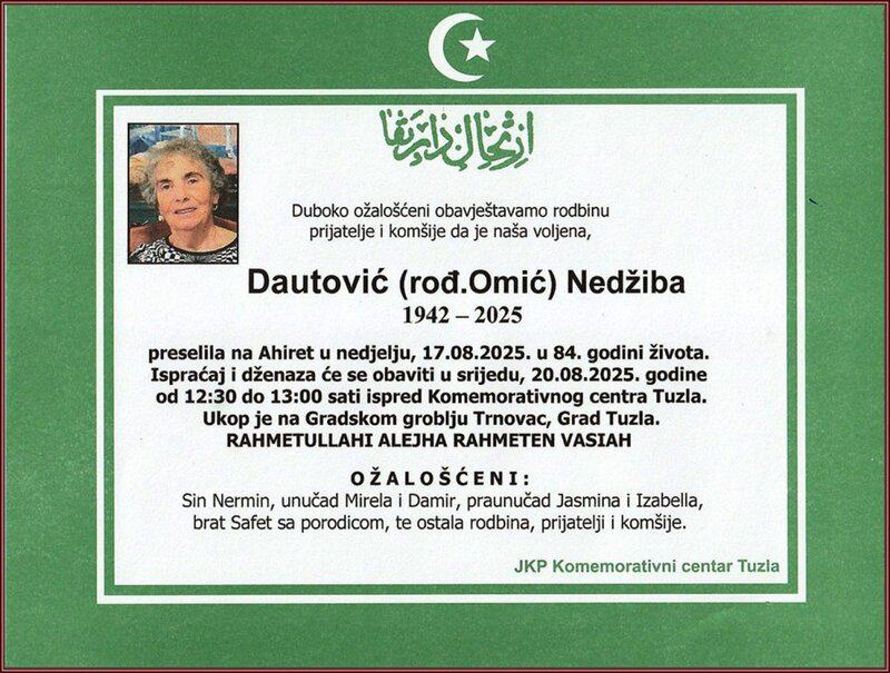 Ispraćaj i dženaza će se obaviti u srijedu, 20. augusta 2025. godine, ispred Komemorativnog centra u Tuzli, od 12:30 do 13:00 sati. Ukop je na Gradskom groblju Trnovac