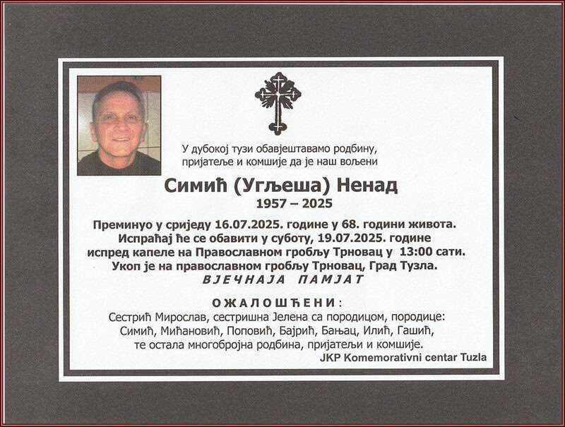 In memoriam: Nenad (Uglješe) SIMIĆPreminuo je u 68. godini. Počivao u miru Božjem. Laka mu bh. zemlja Desk17. 07. 2025.In memoriam, Info (Porodici, rodbini i prijateljima upućujemo iskreno saučešće – TuzlaL!VE.ba, Foto: Komemorativni centar Tuzla) Post Views: 334 Podijeli
