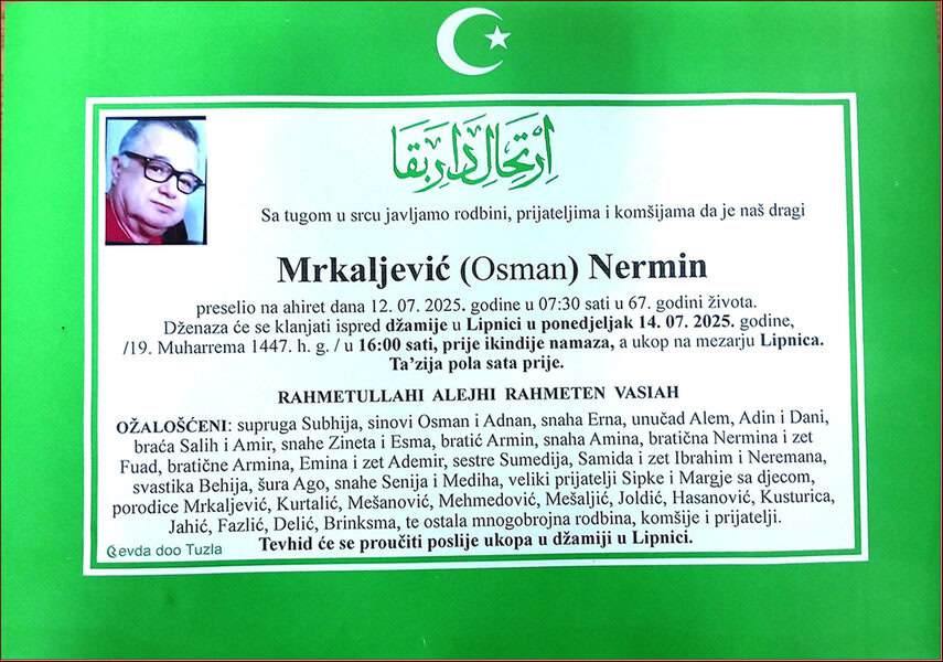 Dženaza će se klanjati ispred džamije u Lipnici, u ponedjeljak, 14. jula 2025. godine u 16 sati. Ukop je na mezarju Lipnica