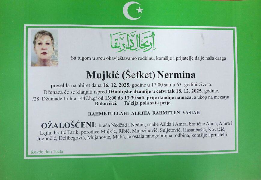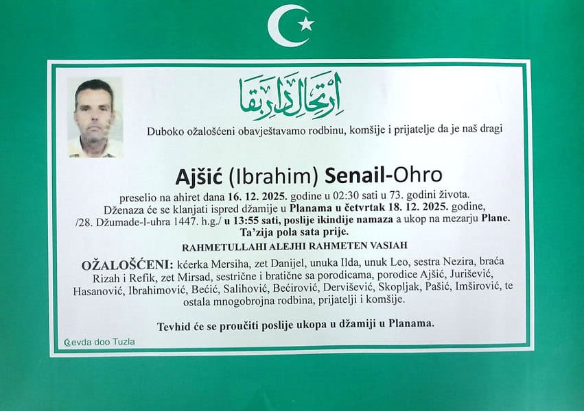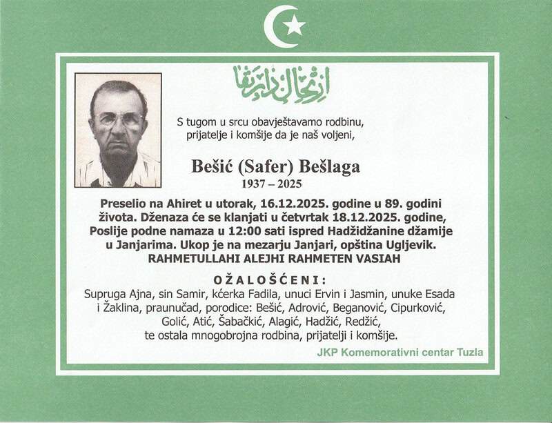 In memoriam: Nermina (Šefketa) MUJKIĆ, Senail (Ibrahima) AJŠIĆ – Ohro, Bešlaga (Safera) BEŠIĆNeka je vječni rahmet njihovim plemenitim dušama. Laka im bh. zemlja... Desk17. 12. 2025.In memoriam, Info (Porodicama i rodbini upućujemo saučešće i sabur. Mir dušama njihovim – portal Tuzlalive.ba; Foto: PP Revda i Komemorativni centar Tuzla) Post Views: 117 Podijeli