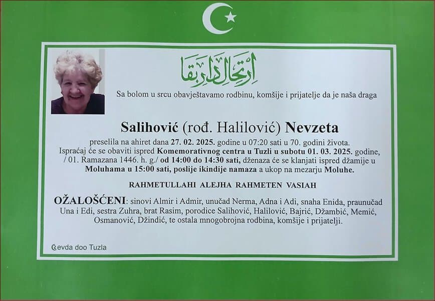 Napustila nas je sugrađanka, prijateljica i komšinica, Nevzeta Salihović (Halilović). Upućujemo joj posljednji pozdrav. Mir duši njenoj. Laka joj bh. zemlja...