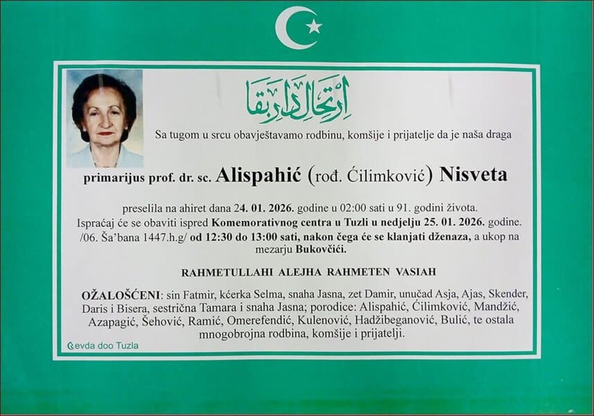Preminula je naša ugledna sugrađanka, prijateljica i komšinica, ginekolog u penziji, prim. prof. dr. Nisveta ALISPAHIĆ (Ćilimković). Upućujemo joj posljednji pozdrav, Porodici i rodbini saučešće. Mir duši njenoj. Laka joj bh. zemlja