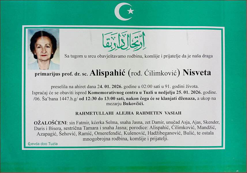 Preminula je naša ugledna sugrađanka, prijateljica i komšinica, ginekolog u penziji, prim. prof. dr. Nisveta ALISPAHIĆ (Ćilimković). Upućujemo joj posljednji pozdrav, Porodici i rodbini saučešće. Mir duši njenoj. Laka joj bh. zemlja
